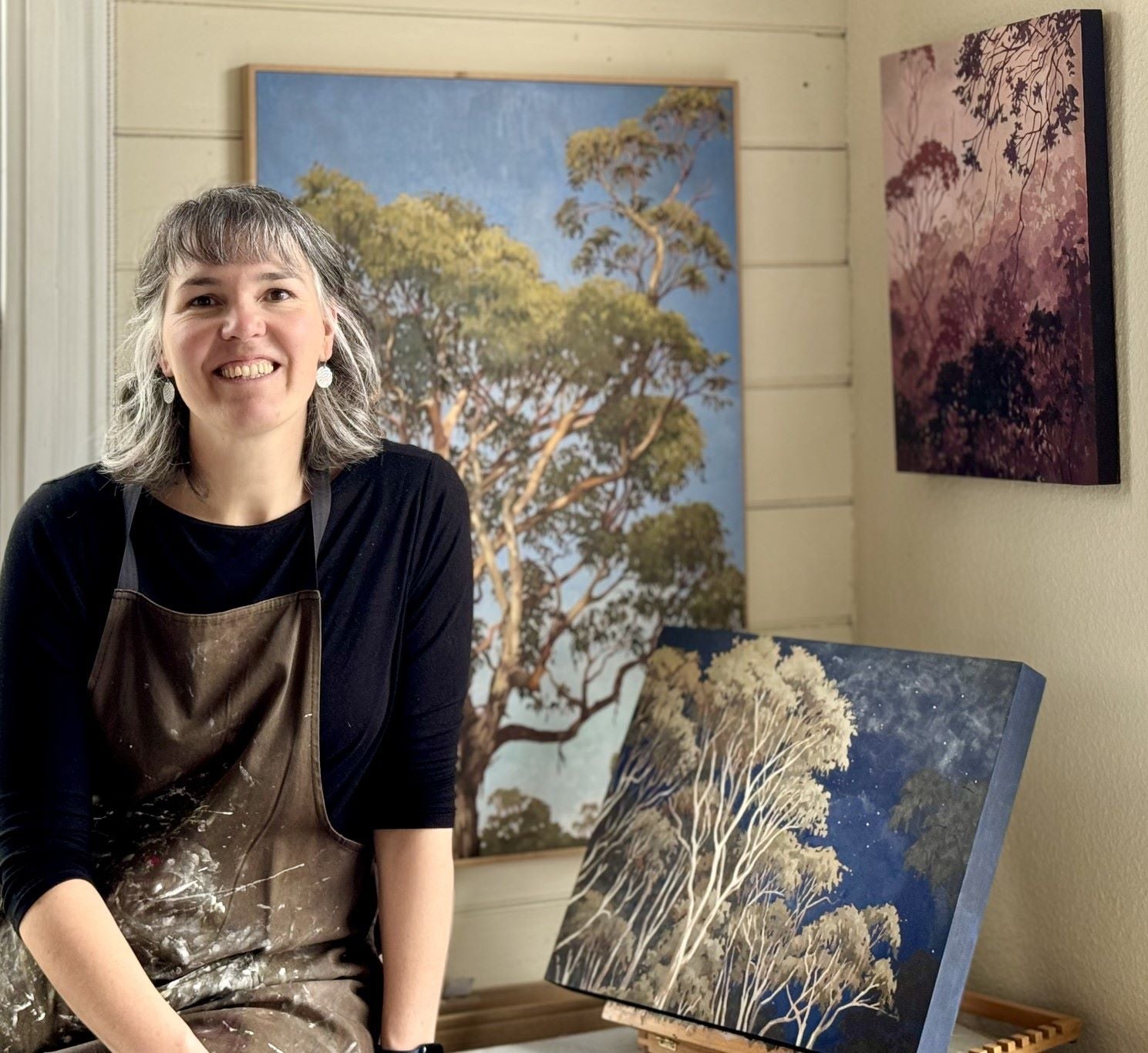 Whether working from within her studio, or outdoors (en plein air), Fiona's oil paintings draw upon Tasmania’s unique colour palette and the distinctive shapes found within landscapes to simplify scenery and highlight her favoured subject matter: Trees.