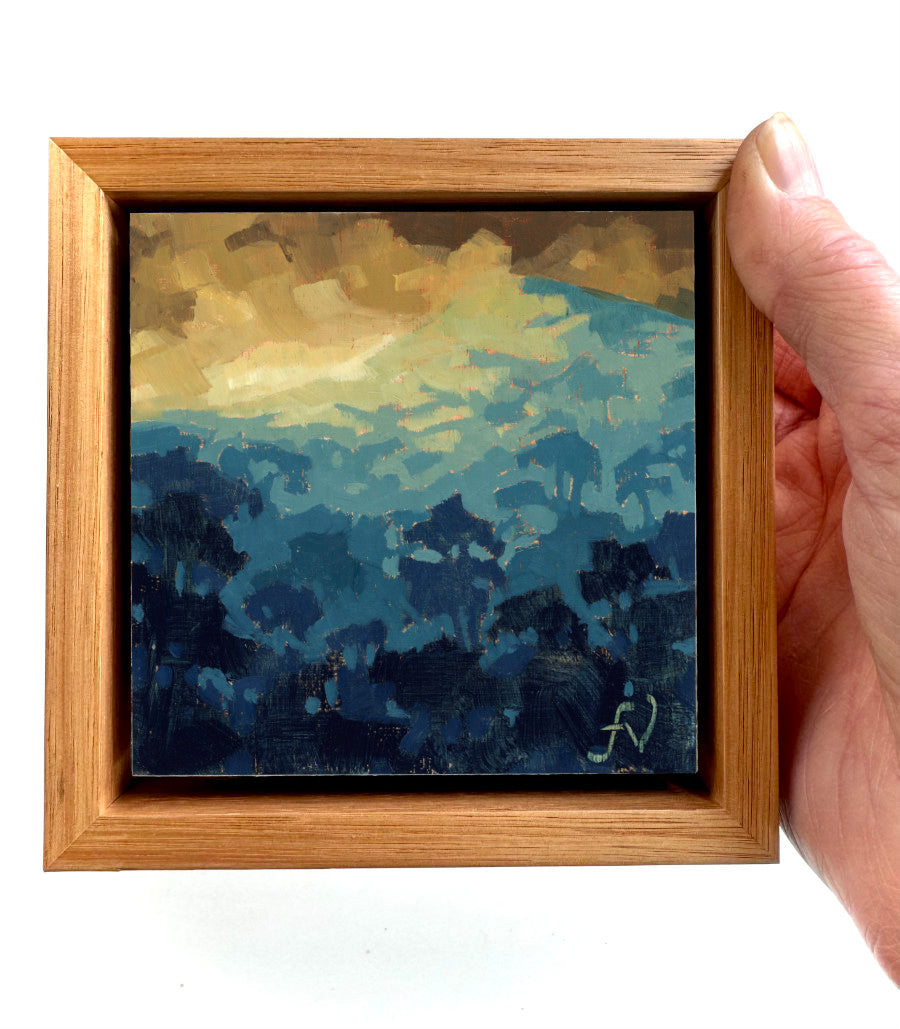 My paintings are framed in raw Tasmanian oak float frames that have a shadow line between the painting and the frame edge. All frames come ready-to-hang, with D-Hooks and wire on the reverse side. Paintings are 6cm / 2 inches wider and taller when framed.