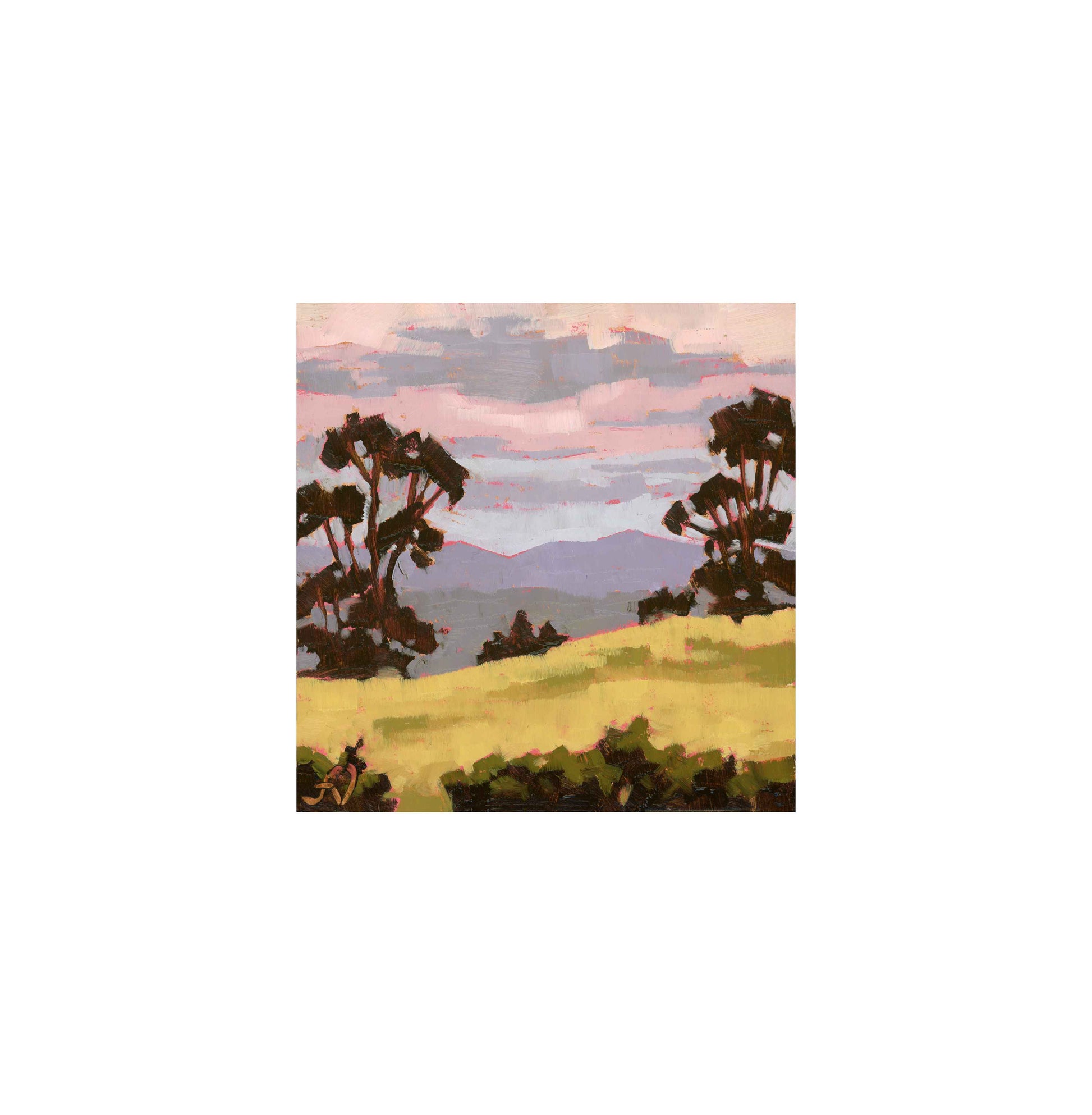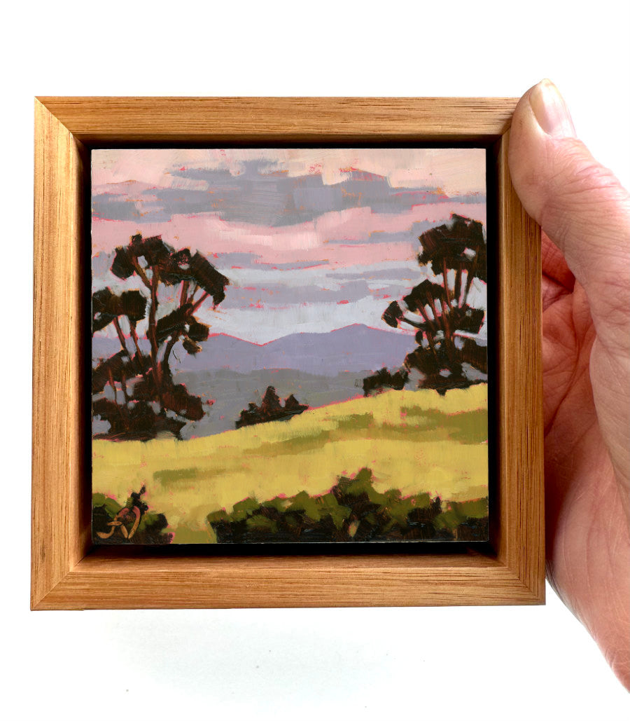 My paintings are framed in raw Tasmanian oak float frames that have a shadow line between the painting and the frame edge. All frames come ready-to-hang, with D-Hooks and wire on the reverse side. Paintings are 6cm / 2 inches wider and taller when framed.