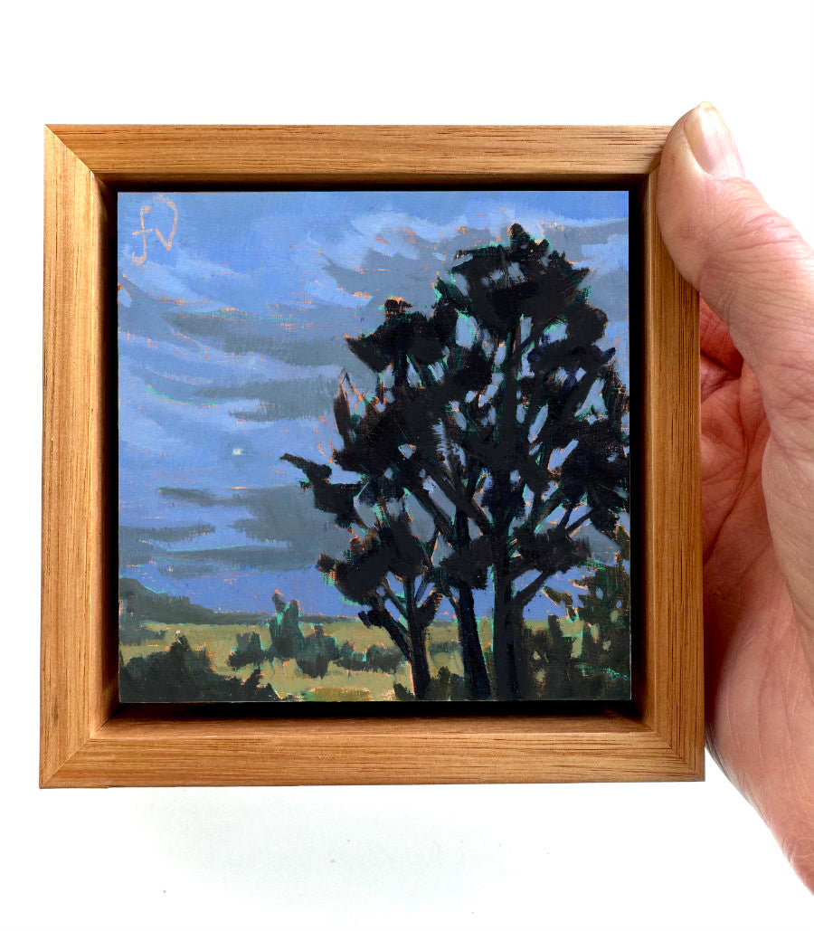 My paintings are framed in raw Tasmanian oak float frames that have a shadow line between the painting and the frame edge. All frames come ready-to-hang, with D-Hooks and wire on the reverse side. Paintings are 6cm / 2 inches wider and taller when framed.