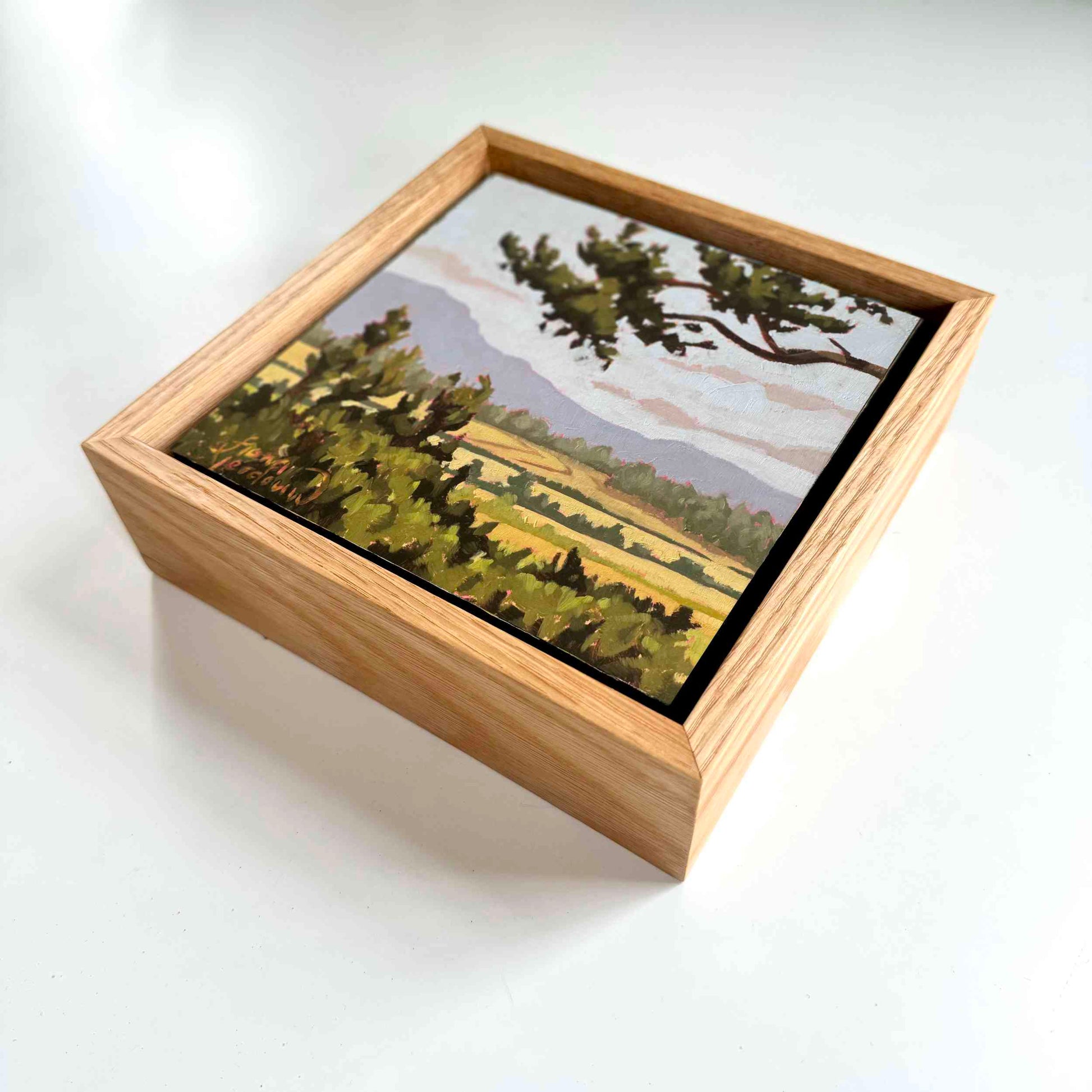 My paintings are framed in raw Tasmanian oak float frames that have a shadow line between the painting and the frame edge. All frames come ready-to-hang, with D-Hooks and wire on the reverse side. Paintings are 6cm / 2 inches wider and taller when framed.