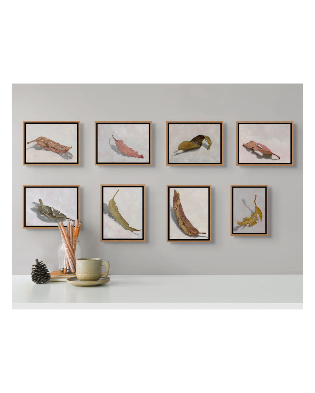 My paintings are framed in raw Tasmanian oak float frames that have a shadow line between the painting and the frame edge. All frames come ready-to-hang, with D-Hooks and wire on the reverse side. Paintings are 6cm / 2 inches wider and taller when framed.