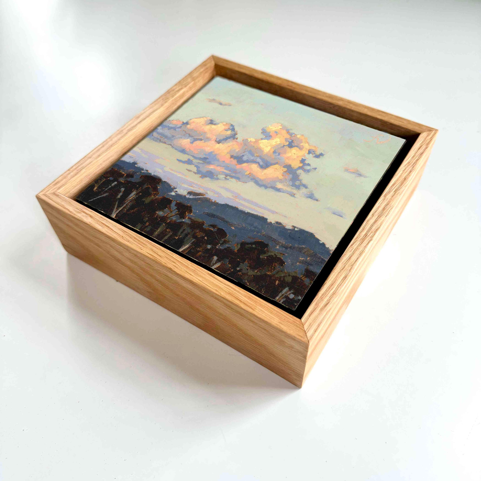 My paintings are framed in raw Tasmanian oak float frames that have a shadow line between the painting and the frame edge. All frames come ready-to-hang, with D-Hooks and wire on the reverse side. Paintings are 6cm / 2 inches wider and taller when framed.