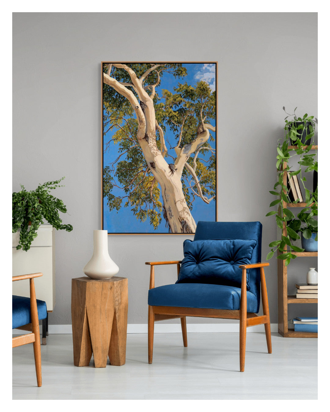 My paintings are framed in raw Tasmanian oak float frames that have a shadow line between the painting and the frame edge. All frames come ready-to-hang, with D-Hooks and wire on the reverse side. Paintings are 6cm / 2 inches wider and taller when framed.