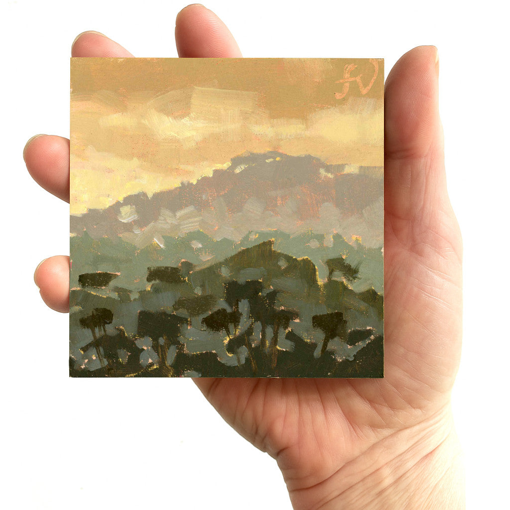 Unless otherwise stated, all of my paintings have been created with artists-quality oil paints on pre-primed/gessoed panel. They are finished with artists' quality retouch varnish.
