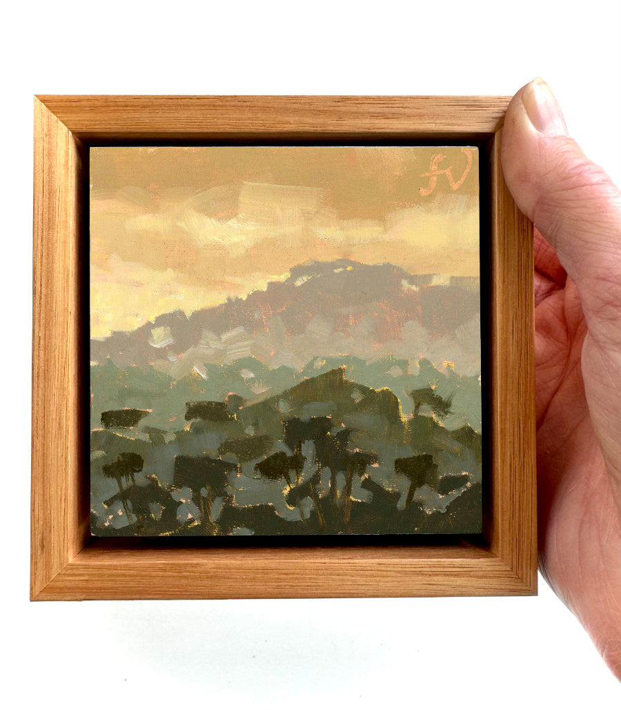 My paintings are framed in raw Tasmanian oak float frames that have a shadow line between the painting and the frame edge. All frames come ready-to-hang, with D-Hooks and wire on the reverse side. Paintings are 6cm / 2 inches wider and taller when framed.
